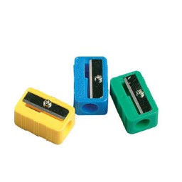 Sacapuntas de plástico con depósito doble uso 100% reciclable certificado según la Norma EN-71. Marca Faibo. Referencia 2102.